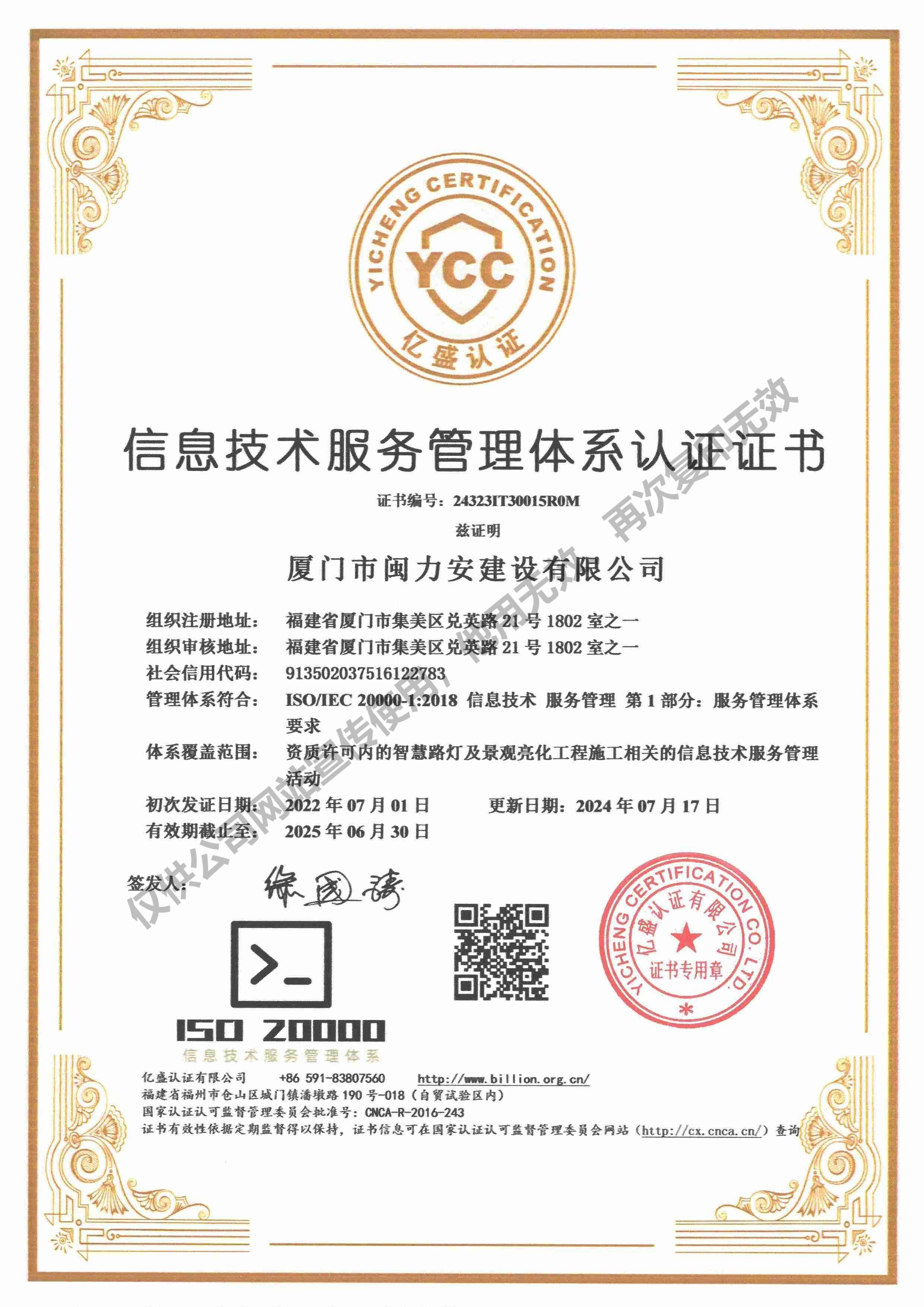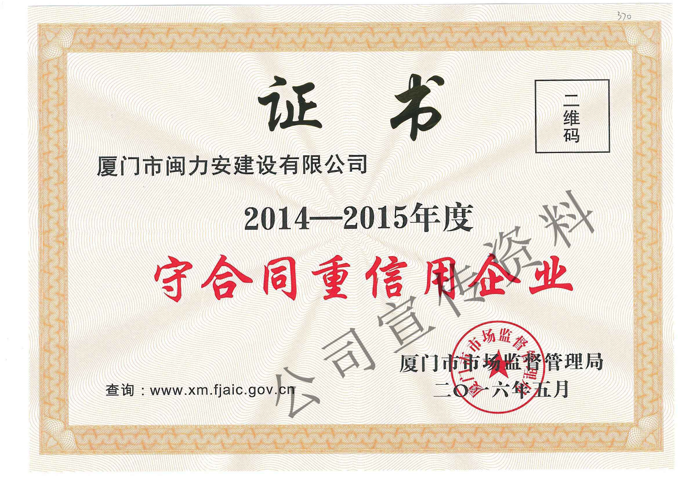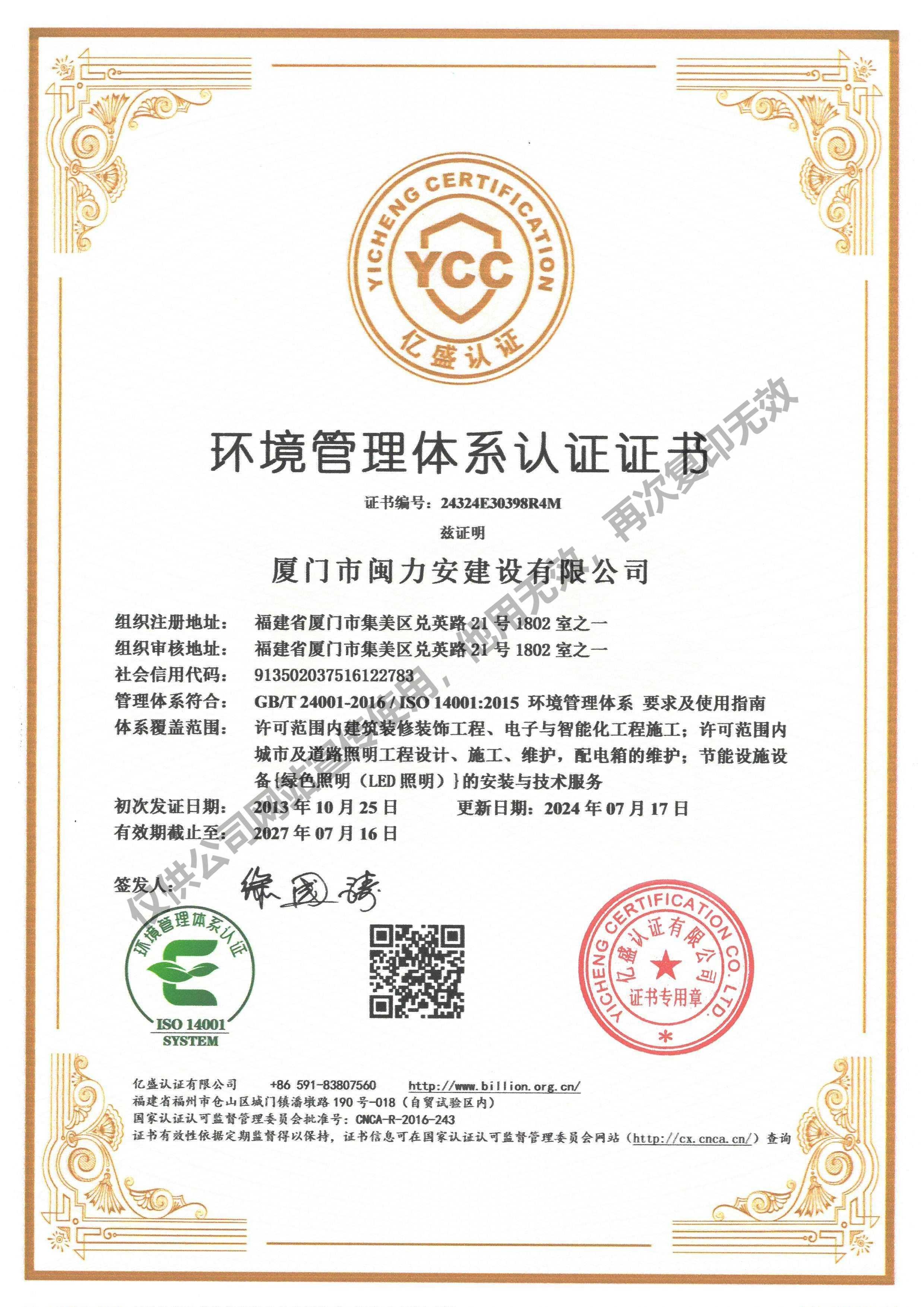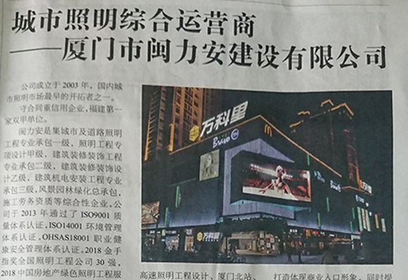 廈門市閩力安建設有限公司成立于2003年,公司取得市政公用工程施工總承包貳級、建筑裝修裝飾工程專業(yè)承包壹級、城市及道路照明工程專業(yè)承包壹級、電子與智能化工程專業(yè)承包貳級、消防設施工程專業(yè)承包貳級、電力工程施工總承包叁級、建筑機電安裝工程專業(yè)承包叁級、輸變電工程專業(yè)承包叁級、環(huán)保工程專業(yè)承包叁級、照明工程設計專項甲級、建筑裝飾工程設計乙級、施工勞務等資質的綜合型企業(yè),公司于2013年通過了ISO9001質量體系認證,ISO14001環(huán)境管理體系認證,OHSAS18001職業(yè)健康安全管理體系認證。